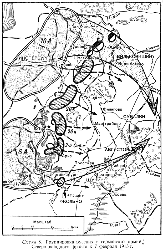 Схема 9. Группировка русских и германских Северо-западного фронта к 7 февраля 1915 г. (стр. 48)
